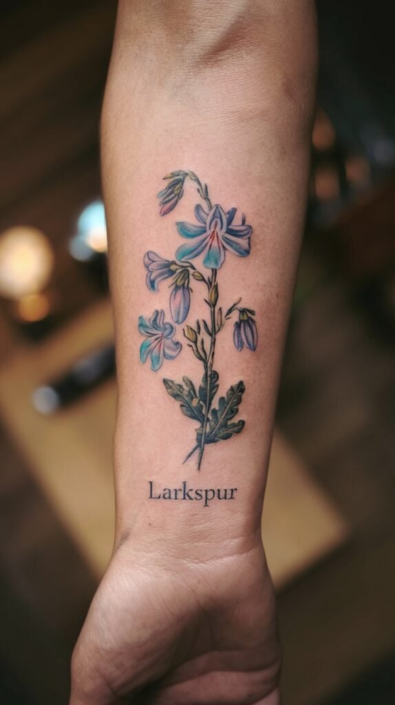 When choosing a design for your delicate larkspur wrist tattoo, think about the personal significance you want to assign to the piece. Larkspur is often associated with qualities like courage, dignity, and refinement.