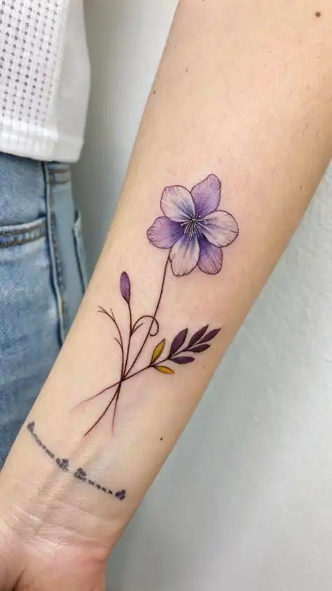 A delicate violet sprouting from a slender stem on your forearm makes for a beautiful, understated tattoo design.