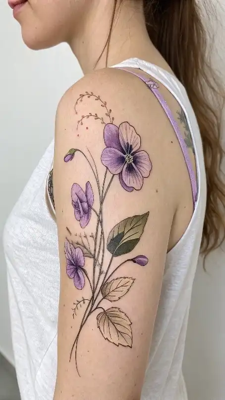 The shoulder placement creates a beautiful frame for the tattoo, drawing the eye to the delicate petals. You can pair the violet with subtle floral accents, such as tiny leaves or stems, to create a sense of movement and flow.