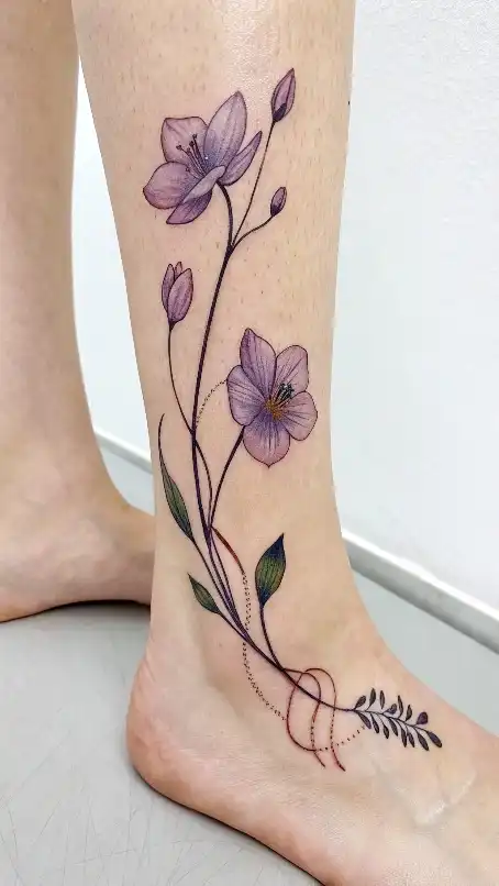 A violet and bud tattoo on the ankle can be designed with delicate accents, such as tiny leaves or tendrils, to create a sense of movement and fluidity.