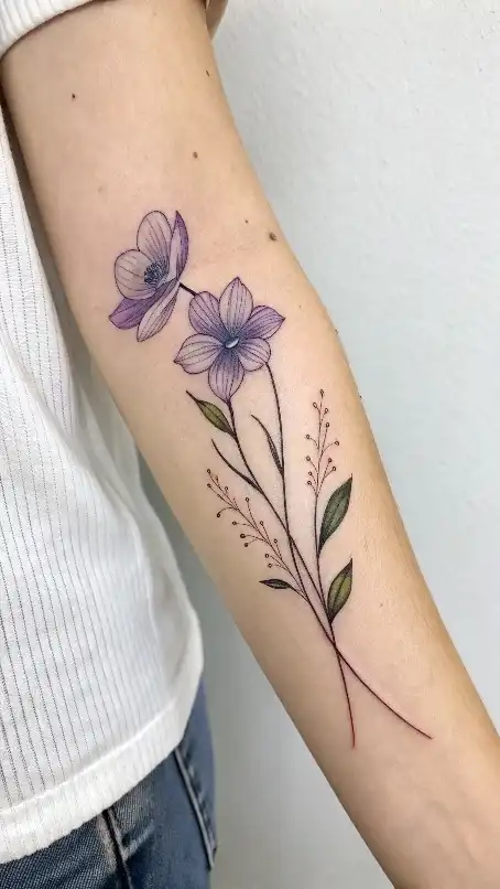 When considering a violet and stem forearm tattoo, think about the stem placement and how it will interact with the surrounding skin.