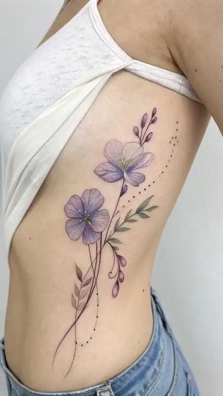 Elegance meets expressionism in a violet and bloom ribcage tattoo, where delicate petals and stems weave together to create a breathtaking work of art on your torso.