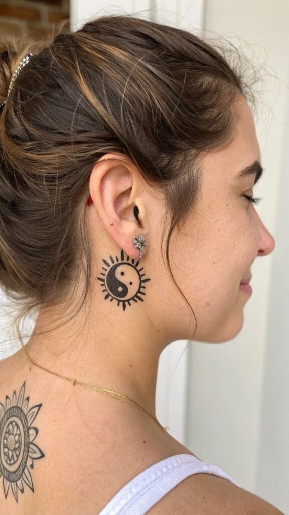 This design fits on your forearm or chest. A forearm tattoo is easy to see. Chest placement feels personal—close to your heart. Imagine the sun’s rays and moon’s crescent curling into the yin-yang shape. A pal got hers in watercolor style—soft blues and yellows. She said, “It’s like my day-and-night reminder.” I love that energy.