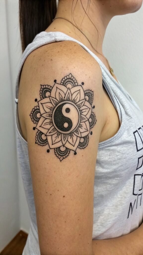 A yin-yang mandala tattoo mixes symmetry with balance. The yin-yang circle sits inside a mandala’s patterns. Black and white halves blend into intricate lines. Women love this for its detailed, artsy look. It’s a showstopper.