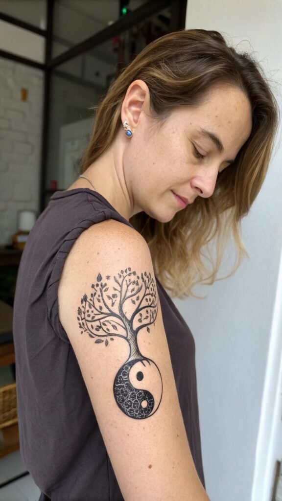 A yin-yang tree of life tattoo roots balance in nature. The tree’s trunk splits the yin-yang circle. Roots dig into the black half, branches reach the white. Women pick this for its earthy feel. It’s strong and alive.