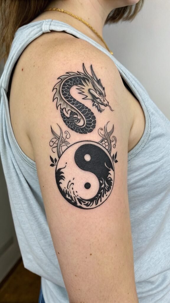 A yin-yang dragon tattoo brings power to balance. The dragon curls into the yin-yang shape. Its body fills both halves—black and white. Women choose this for its fierce vibe. It’s bold and badass.