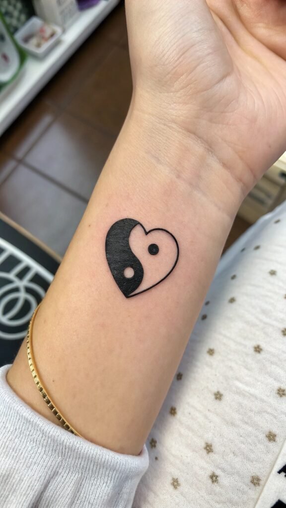 This design suits your chest or ankle. Chest placement is close to your heart. Ankle? Cute with sandals. Imagine a heart with soft curves in the yin-yang style. A buddy got hers for her partner. She said, “It’s us together.” I love that—it’s personal.