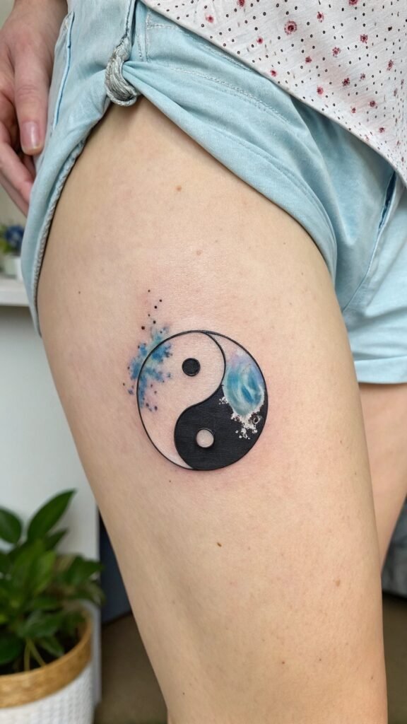 This tattoo fits your thigh or upper arm. Thigh placement is bold with shorts. Upper arm? Cool with a sleeve. Picture a yin-yang with watercolor streaks flowing out. A friend got hers in purple and teal. She said, “It’s my happy place.” I see why—it’s vibrant.
